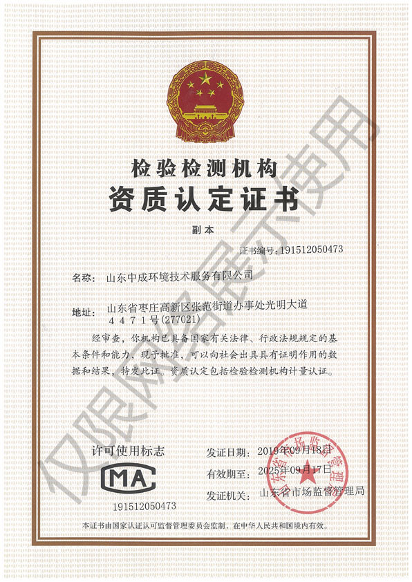 山東中成環境技術服務有限公司,公司成立于2019年3月,注冊資金壹仟零陸元整,是棗莊地區第一家取得生態環境檢測行業CMA資質的第三方專業環境檢測機構。